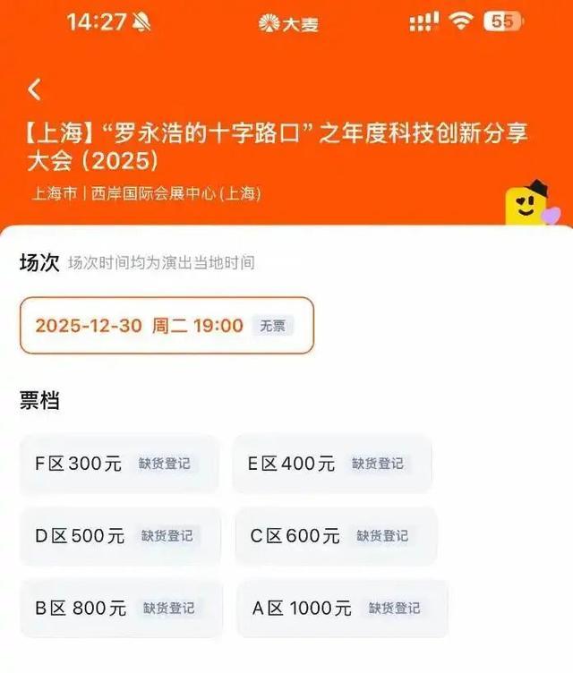 12月22日午间,“罗永浩的十字路口”年度科技创新分享大会门票正式开售。此次大会门票分为300元、400元、500元、600元、800元、1000元6档,服务说明显示:不支持退票、实名制购票和入场、不支持选座。